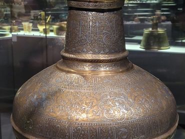 This 14th century masterpiece was created by Muhammad ibn al-Zayn, a coppersmith who hammered and engraved the vessel before inlaying brass, gold, and silver on the surface in intricate patterns.