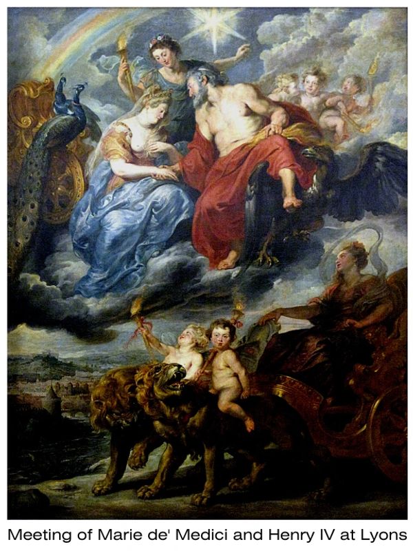 Looking over the scene is Jupiter with Juno. They look down as Henry IV is presented with a portrait of Marie, and he is clearly awed by her beauty — we can almost see him swooning. The portrait is held by none other than Cupid (the god of love) and Hymen (the god of marriage). Whispering in his ear is a personification of France.